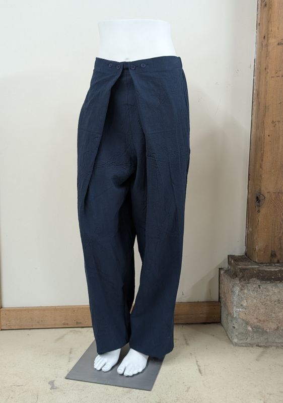 Wrap front pant with side pockets and a double button front closure. The measurement from waist to hem is 43″ and the inseam is 30.”